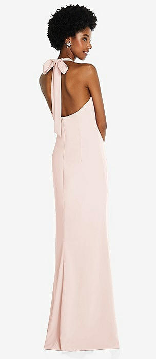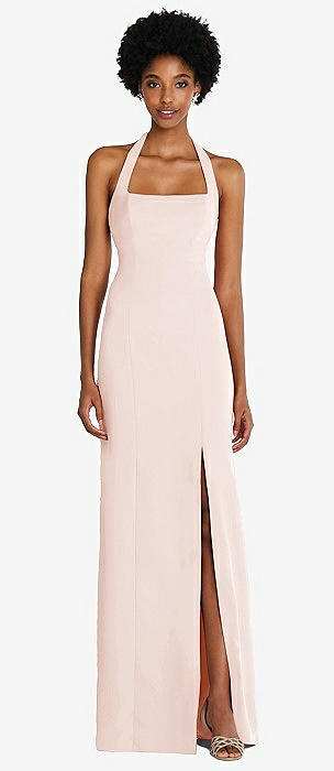 Shirred Skirt Jewel Neck Halter Dress with Front Slit in blush