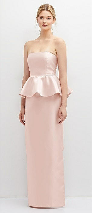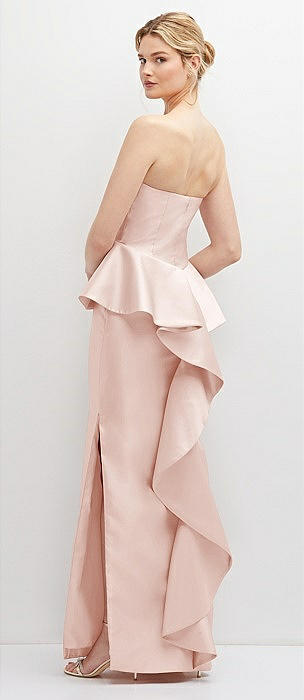 Strapless Satin Maxi Dress with Cascade Ruffle Peplum Detail in blush