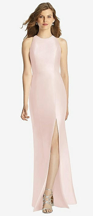 Jewel Neck Bowed Open-Back Trumpet Dress with Front Slit in blush