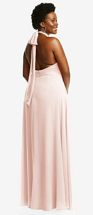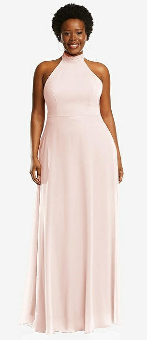 High-Neck Halter Open-Back Satin Trumpet Dress in blush