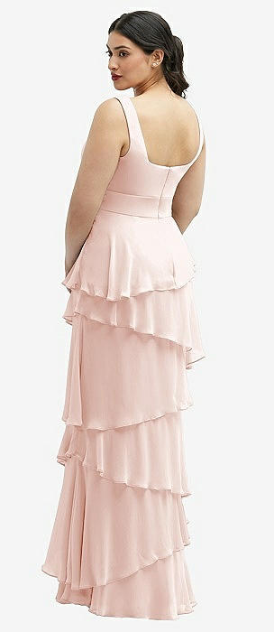 Bow-Shoulder Satin Maxi Dress with Asymmetrical Tiered Skirt in blush