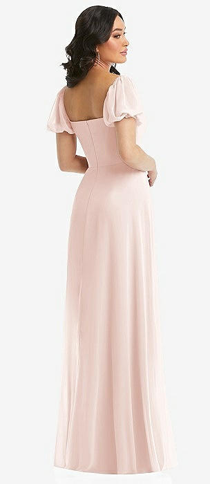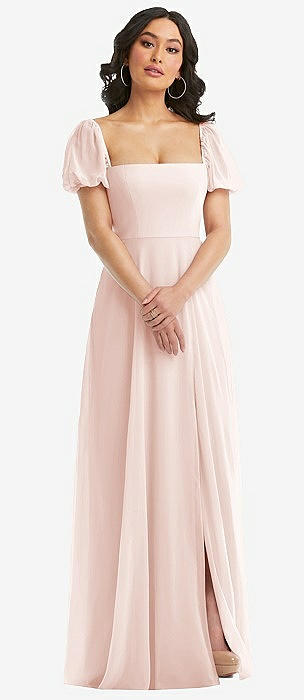 Puff Sleeve Chiffon Maxi Dress with Front Slit in blush