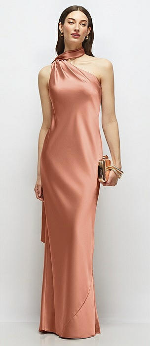 Draped Scarf One-Shoulder Bias Stretch Satin Maxi Dress in copper penny