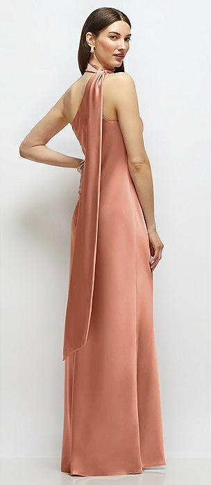 Draped Scarf Halter Open-Back Stretch Satin Bias Maxi Dress with Adjustable Straps in copper penny