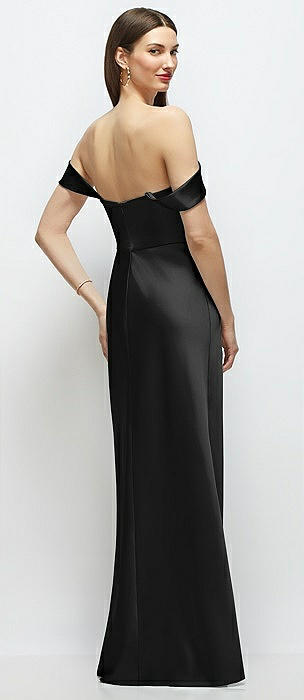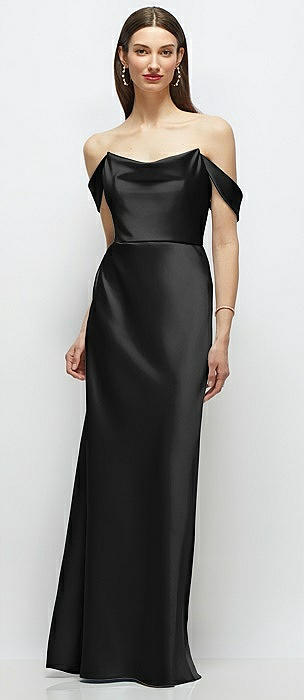 Basque-Neck A-Line Stretch Satin Maxi Dress with Off-the-Shoulder Drape in black