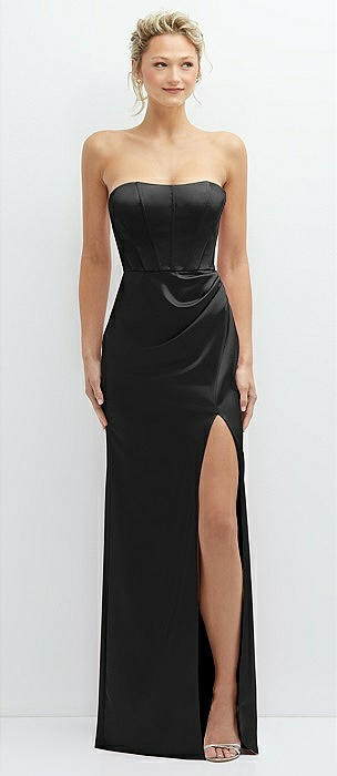 Strapless Topstitched Corset Satin Maxi Dress with Draped Column Skirt in black