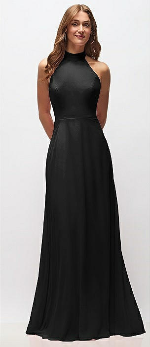 Shirred Skirt Jewel Neck Halter Dress with Front Slit in black