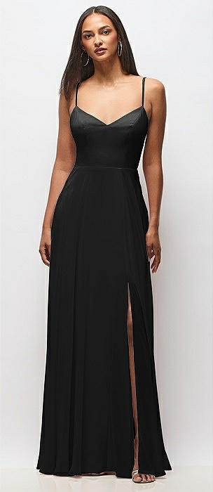 Spaghetti Strap Draped Skirt Gown with Front Slit in black