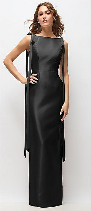 Bateau Neck Satin Column Maxi Dress with Exaggerated Tail Bow Straps in black
