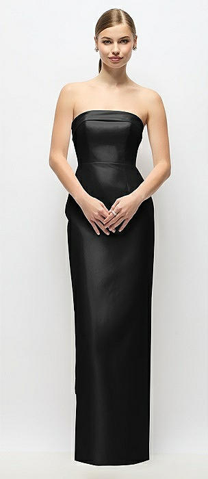 Strapless Draped Bodice Stretch Satin Column Maxi Dress in black