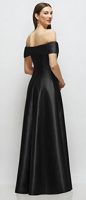 Asymmetrical Bow Off-Shoulder Satin Gown with Ballroom Skirt in black