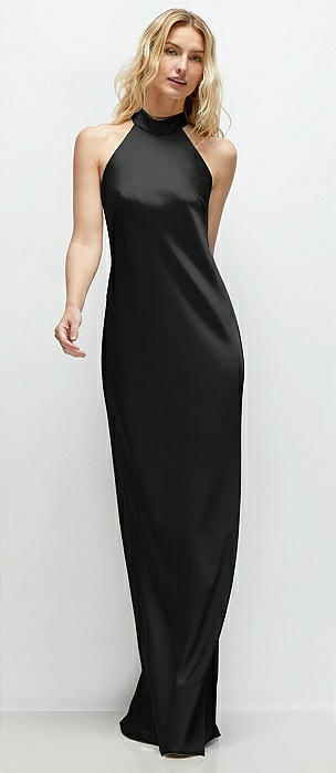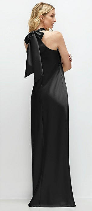 Pleated Halter Bias Satin Maxi Dress with Self-Tie Bow Back in black