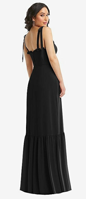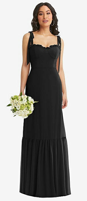 Tie-Shoulder Bustier Bodice Ruffle-Hem Maxi Dress in black