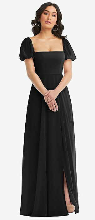 Puff Sleeve Chiffon Maxi Dress with Front Slit in black