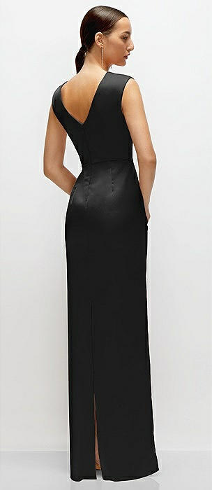 Sleeveless Draped Wrap Bodice Stretch Satin Column Maxi Dress in black