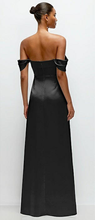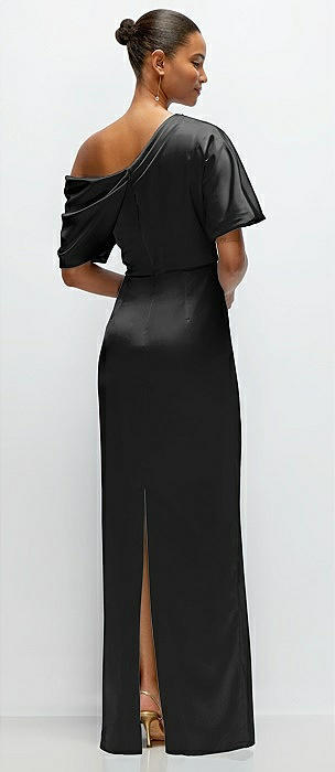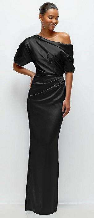 Asymmetrical Off-the-Shoulder Pleated Satin Maxi Dress in black