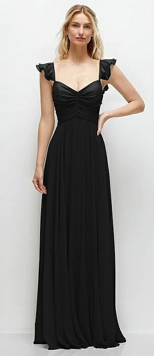 Convertible Ruffle Strap Chiffon Maxi Dress with Full Circle Skirt in black