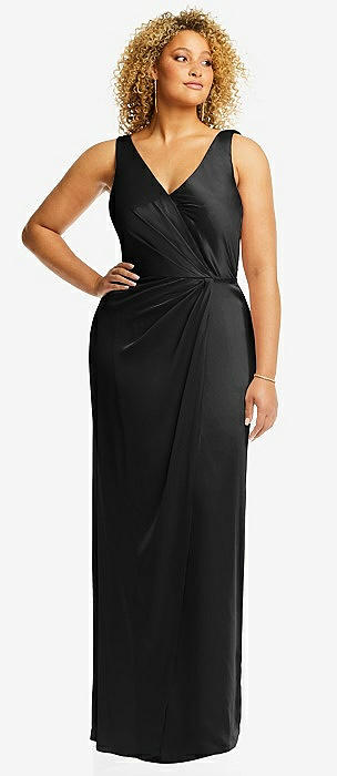 Sleeveless Draped Wrap Bodice Stretch Satin Column Maxi Dress in black