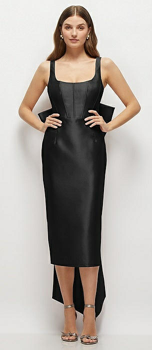 Scoop Neck Corset Satin Midi Dress with Floor-Length Bow Tails in black