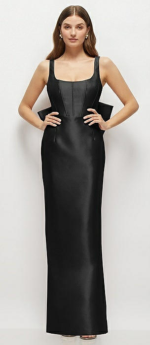 Scoop Neck Corset Satin Maxi Dress with Floor-Length Bow Tails in black