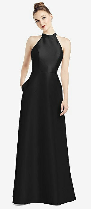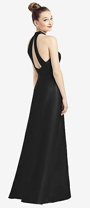 High-Neck Halter Open-Back Satin Trumpet Dress in black