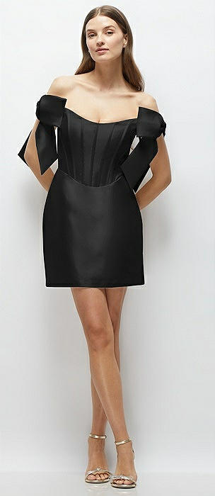 Satin Off-the-Shoulder Bow Corset Fit and Flare Mini Dress in black