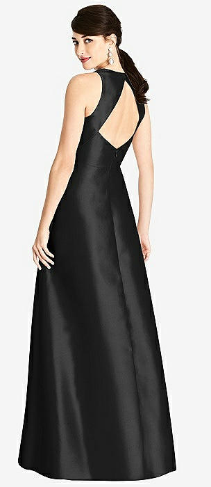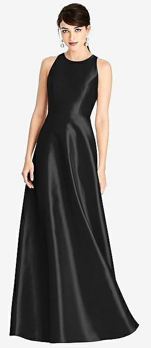 Jewel Neck Halter Full A-Line Satin Maxi Dress in black
