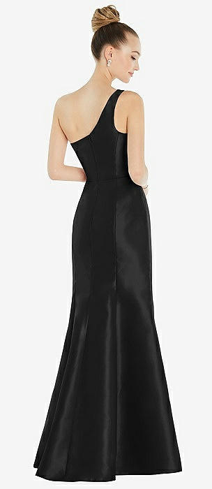 Draped One-Shoulder Satin Trumpet Gown with Front Slit in black
