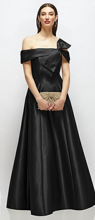Asymmetrical Bow Off-Shoulder Satin Gown with Ballroom Skirt in black