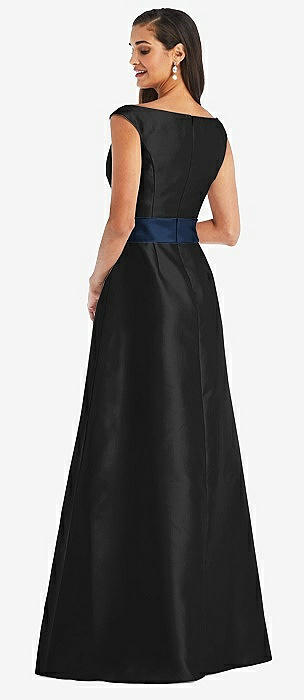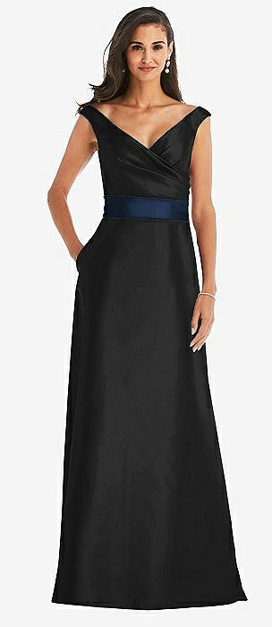 Off-the-Shoulder Draped Wrap Satin Maxi Dress in black