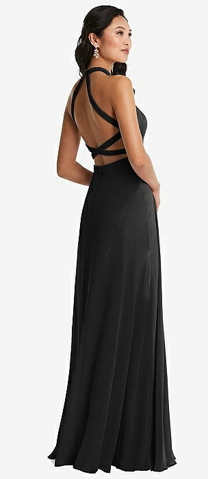 Stand Collar Halter Maxi Dress with Criss Cross Open-Back in black