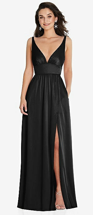 Deep V-Neck Shirred Skirt Maxi Dress with Convertible Straps in black