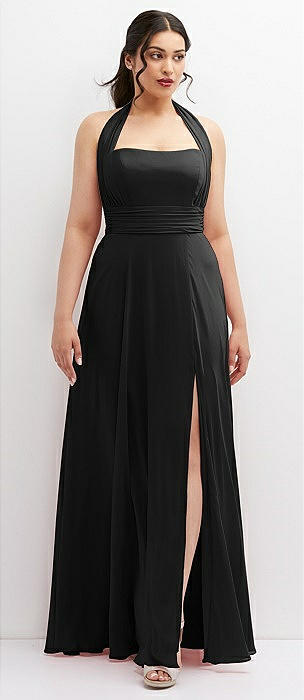 Shirred Skirt Jewel Neck Halter Dress with Front Slit in black