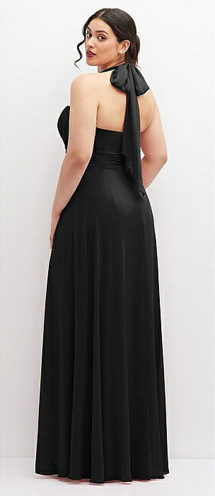 Shirred Halter Chiffon Maxi Dress with Back Sash-Tie Closure in black