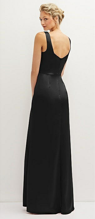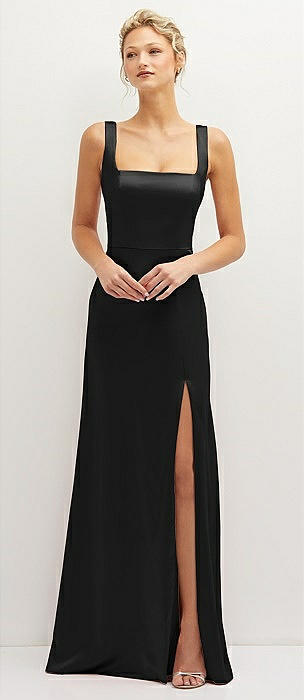 Square-Neck Satin A-line Maxi Dress with Front Slit in black