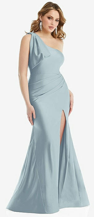 Cascading Bow One-Shoulder Stretch Satin Mermaid Dress with Slight Train in mist