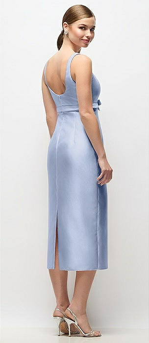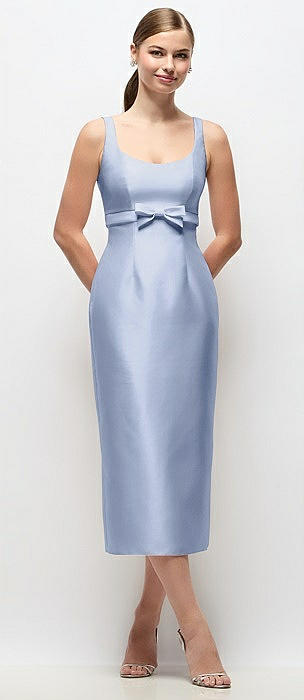 Scoop Neck Satin Column Midi Dress with Bow at Empire Waist in sky blue