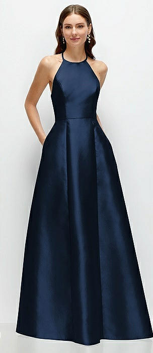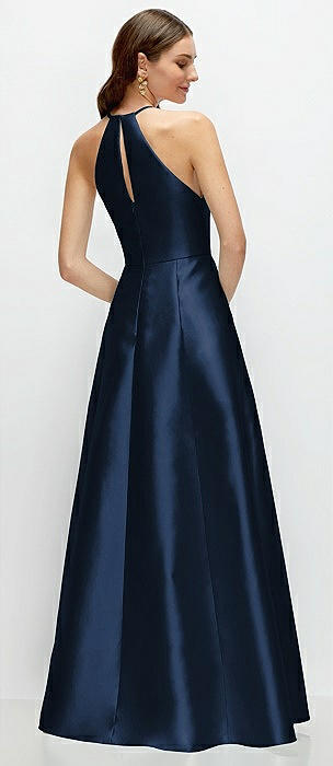 Jewel Neck Halter Full A-Line Satin Maxi Dress in midnight navy