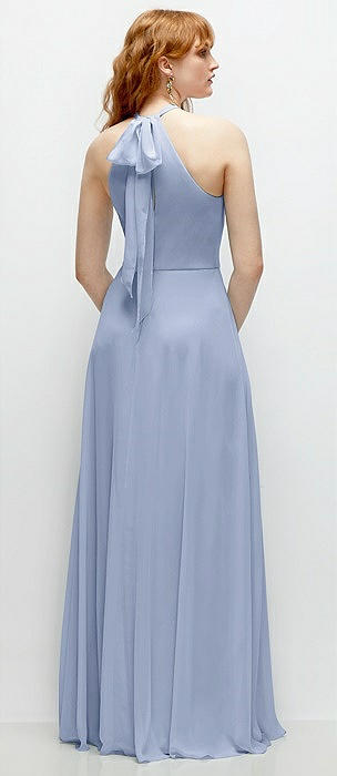 Shirred Halter Chiffon Maxi Dress with Back Sash-Tie Closure in sky blue