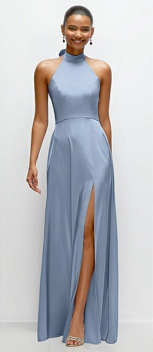 High-Neck Halter Open-Back Satin Trumpet Dress in larkspur blue