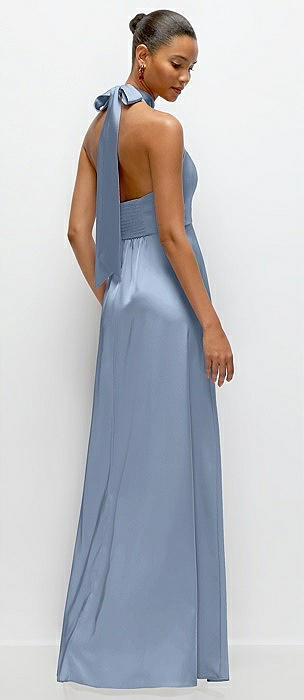 Band Collar Halter Open Back Fluid Satin Maxi Dress with Self-Tie Bow in cloudy