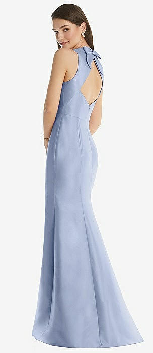 Jewel Neck Bowed Open-Back Trumpet Dress with Front Slit in sky blue