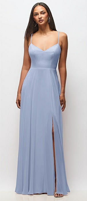 Bow-Shoulder V-Back Chiffon Gown with Front Slit in sky blue