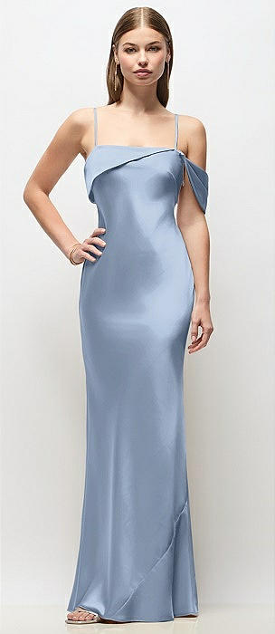 Asymmetrical Cuff Neck Stretch Satin Bias Maxi Dress with Adjustable Spaghetti Straps in cloudy
