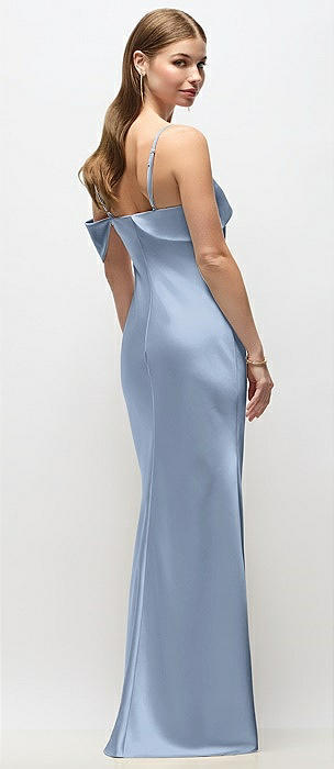 Strapless Pleated Draped Satin Mini Dress with Dramatic Long Tail Bow & Covered Buttons in sky blue