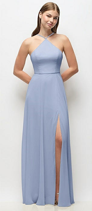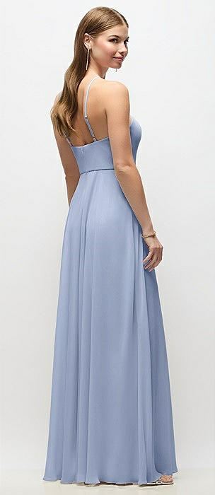 High-Neck Halter Chiffon Maxi Dress with Adjustable Spaghetti Straps in sky blue