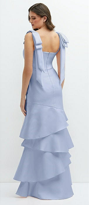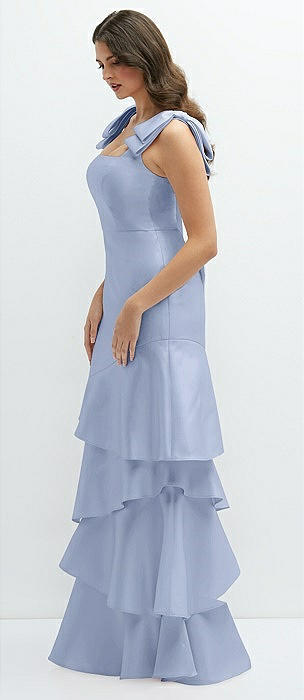 Bow-Shoulder Satin Maxi Dress with Asymmetrical Tiered Skirt in sky blue