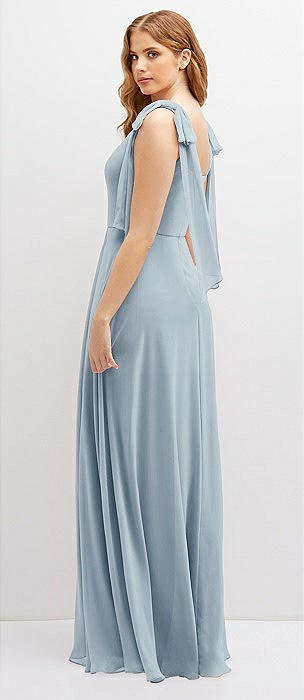 Plunge Neckline Bow Shoulder Empire Waist Chiffon Maxi Dress in sky blue