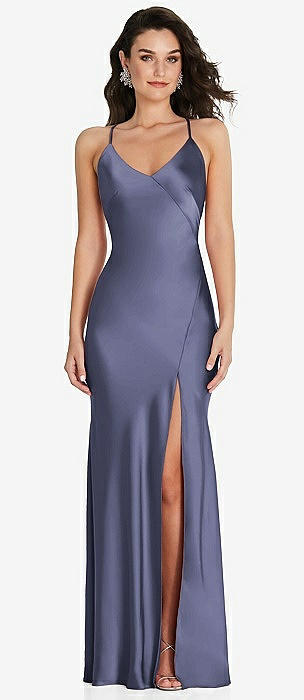 V-Neck Convertible Strap Bias Slip Dress with Front Slit in french blue
