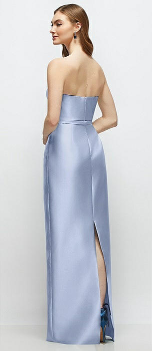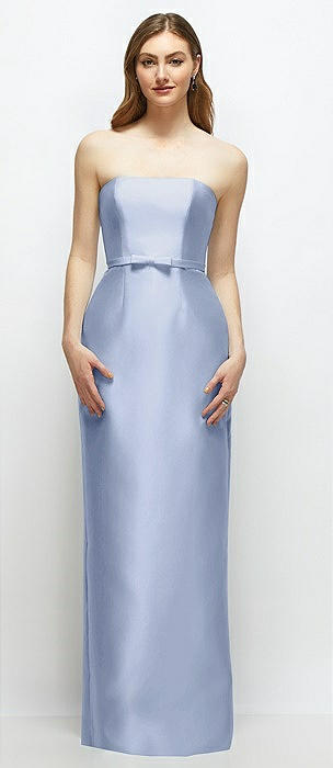 Strapless Satin Column Dress with Bow-Trimmed Skinny Belt in sky blue